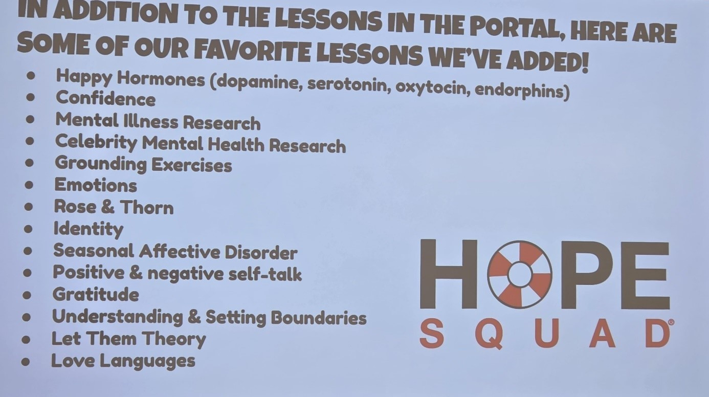 W harmonogramie szkoły aktywnie funkcjonuje program Hope Squad – oparty na dowodach system wsparcia rówieśniczego. Uczniowie wybrani przez kolegów są szkoleni, aby zauważać sygnały trudności i łączyć rówieśników z dorosłym wsparciem. Członkowie Hope Squad nie pełnią funkcji terapeutycznych, lecz wspierają budowanie kultury empatii, odpowiedzialności i wzajemnej troski.