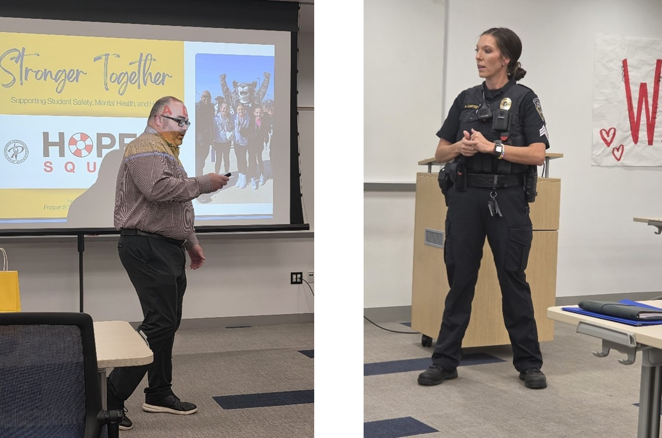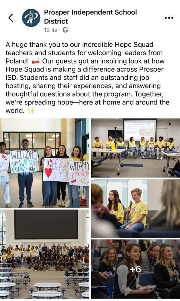 Wizyta w Walnut Grove High School w Prosper w stanie Teksas okazała się jednym z najbardziej pamiętnych momentów wizyty studyjnej. Spotkanie polskiej delegacji z uczniami, nauczycielami i lokalnymi liderami Hope Squad zostało szeroko zrelacjonowane w szkolnych wiadomościach uczniowskich – https://app.smore.com/n/xzsg8-together-we-prosper, a także w materiale filmowym dokumentującym wydarzenie, który jest dostępny online od 1:36 minuty nagrania: https://www.youtube.com/watch?v=y2uIAOKKIzU.